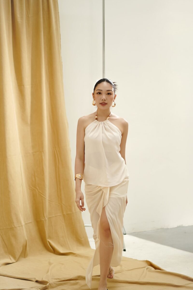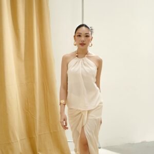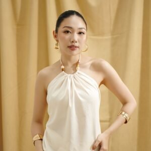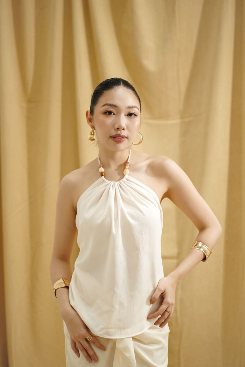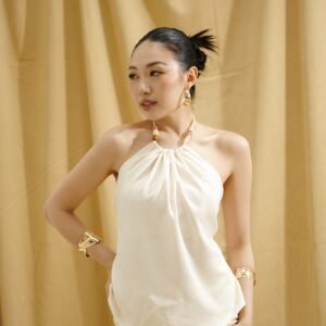 Top elegan dengan desain halter yang feminin, terbuat dari bahan katun snowsheer yang lembut dan ringan, memberikan kesan jatuh alami saat dikenakan. Bagian belakang dilengkapi smocking untuk kenyamanan dan fleksibilitas saat dipakai.