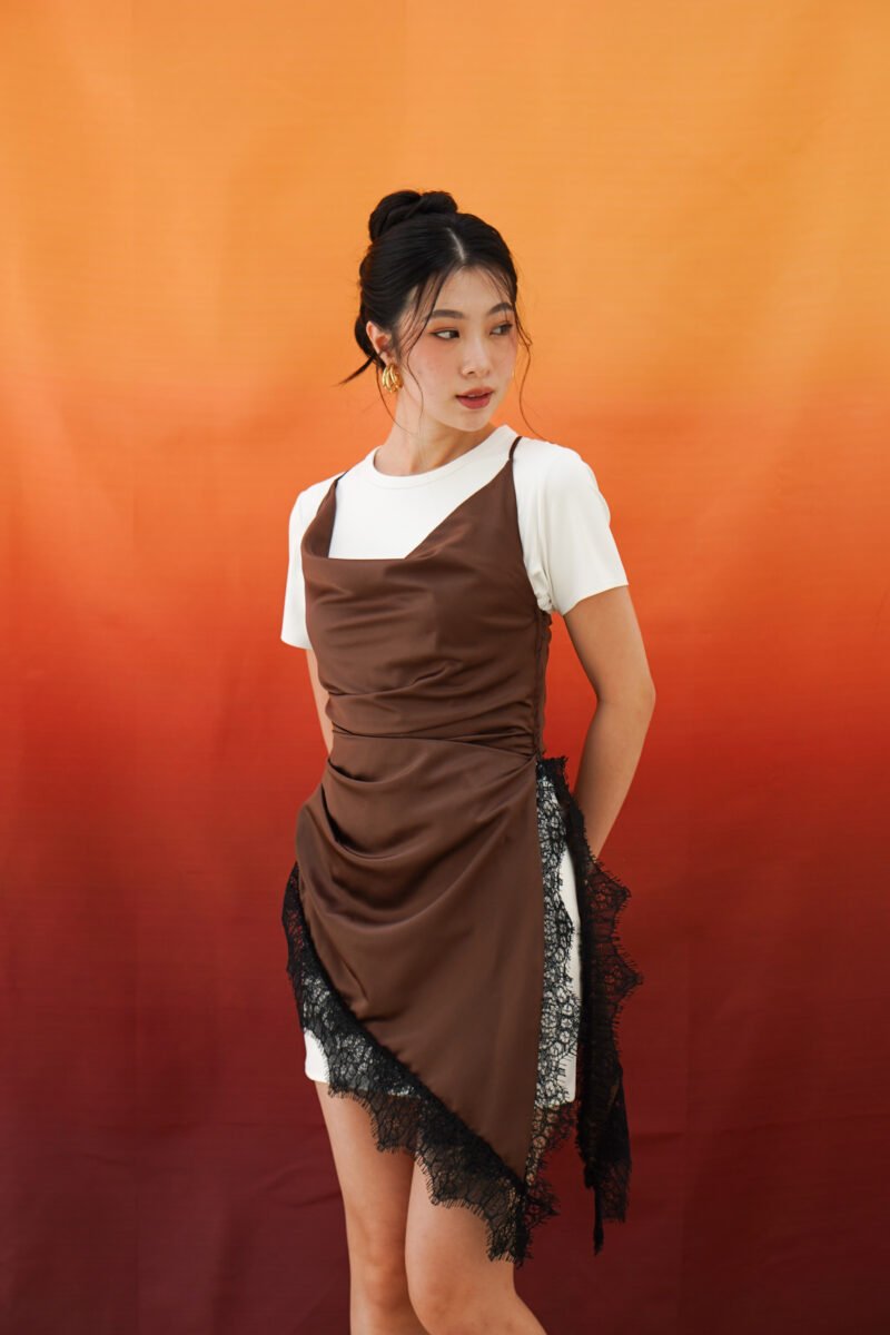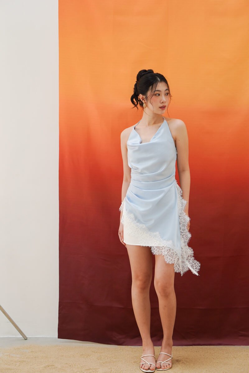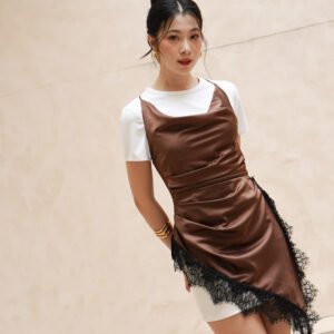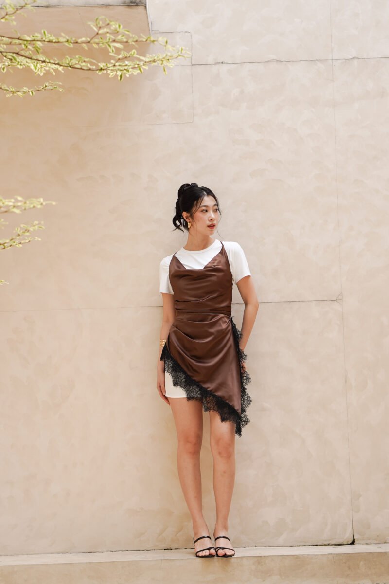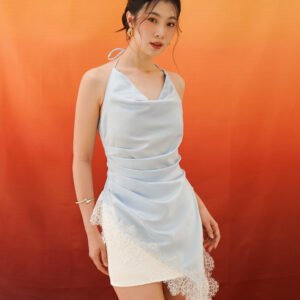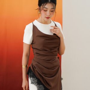 The neckline is designed with a cowl drapery style that forms natural folds across the bust, creating a flowy and effortless chic look. The shoulder straps are adjustable and multifunctional, allowing them to be styled in various ways such as straight, crossed, or other creative variations according to the wearer’s preference.