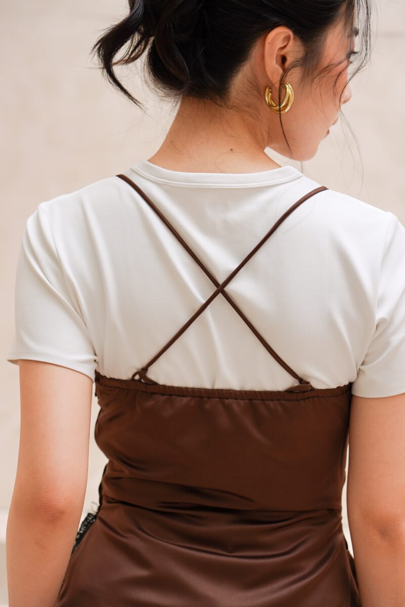 This top is equipped with a side zipper that makes it easier to wear while maintaining a clean and seamless front silhouette. At the back, there is a loop detail that supports additional strap styling options. For added comfort and flexibility, the back is also designed with elastic detailing that adapts to the body shape, ensuring a comfortable fit while still looking neat and well-fitted.