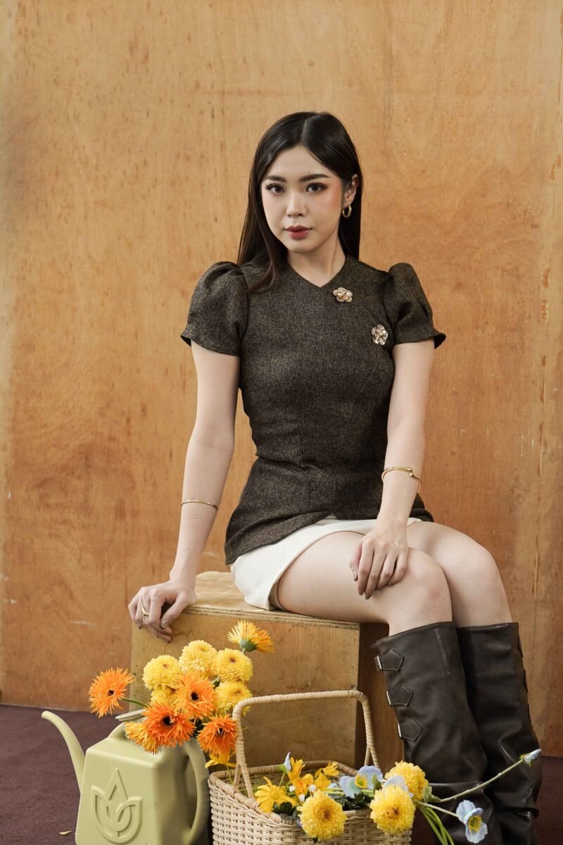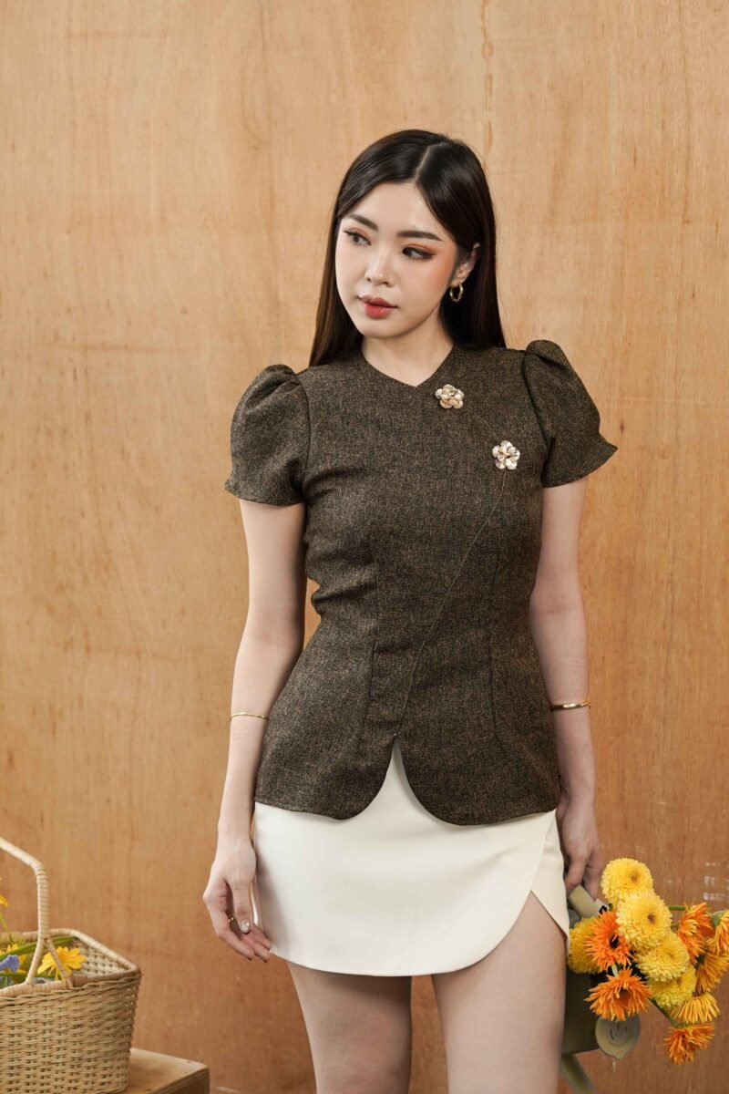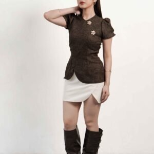A top with an elegant and classy design that provides a feminine silhouette and a sophisticated look. Using brown roman tweed material, the texture looks exclusive with its typical tweed fibers that are smooth, quite thick, but still comfortable when worn. This top has a semi-slim fit that follows the curves of the body without feeling tight. The waist is made slimmer to create a firm and feminine silhouette effect. The bottom detail is made slightly curved (curved hem) so that it gives a sweet and modern impression. The sleeves are designed with short puff sleeves with soft volume on the shoulders, adding a classy touch while emphasizing the shape of the shoulders to look more proportional. On the front there are 2 premium buttons as the main accent that gives a luxurious and elegant impression.