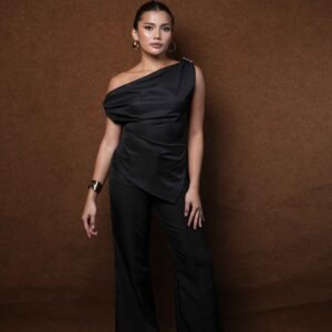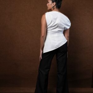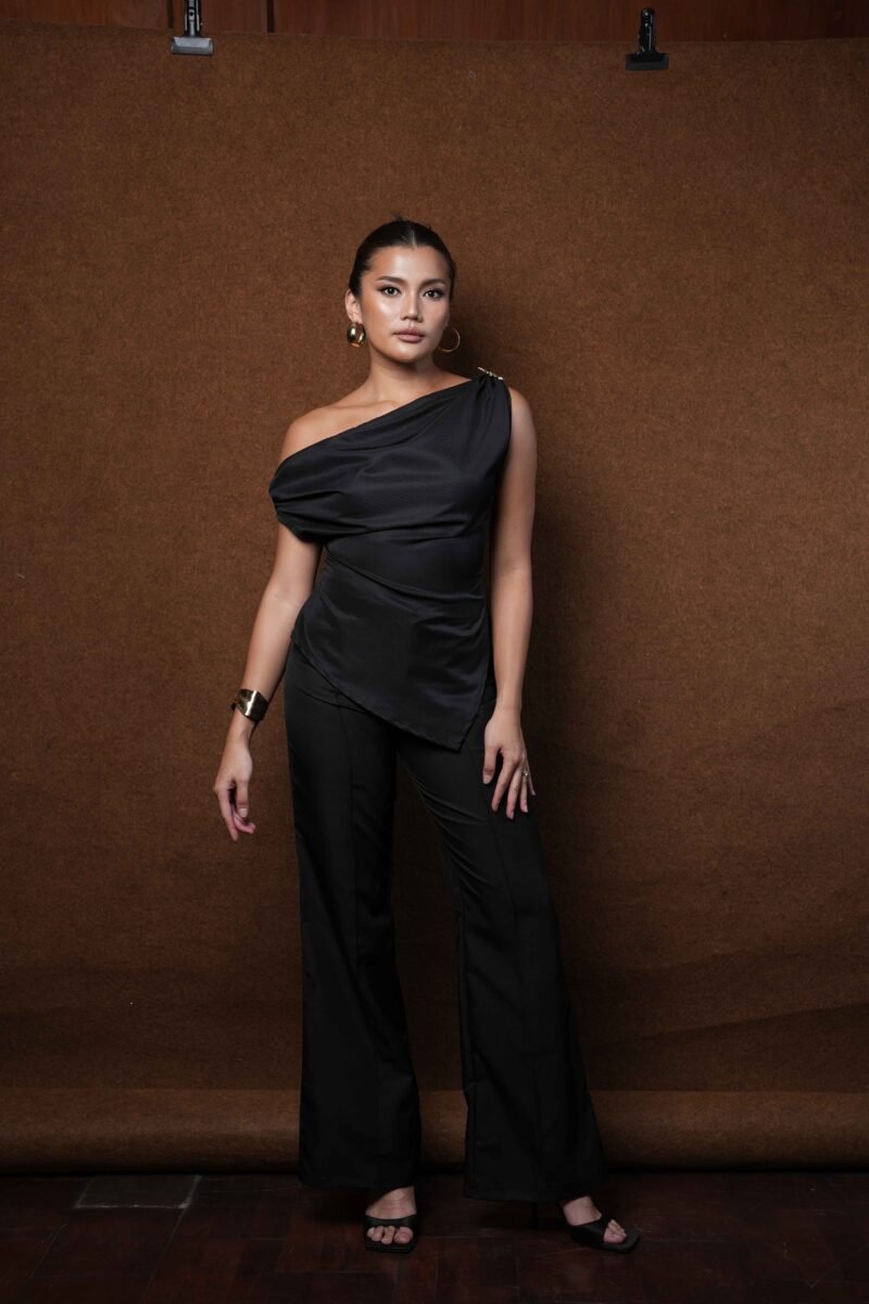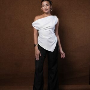 This top is made from Casa Lady and Havana fabrics, known for their smooth texture, elegant drape, and comfort. The design is modern with a one-shoulder cut that accentuates femininity and elegance. The silhouette is shaped by tailored stitching, creating a slim and charming look.