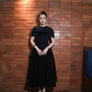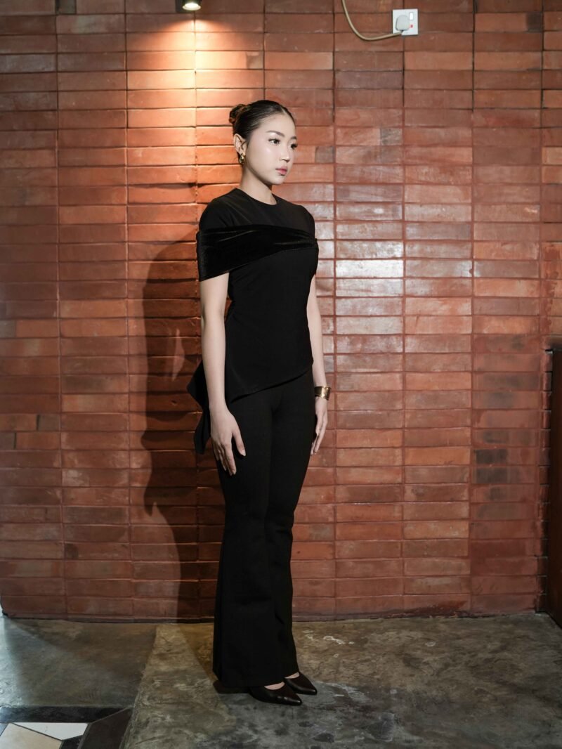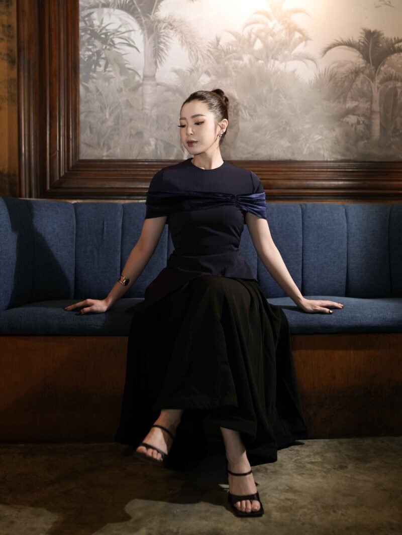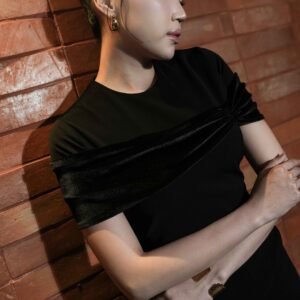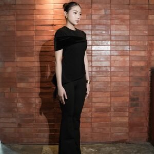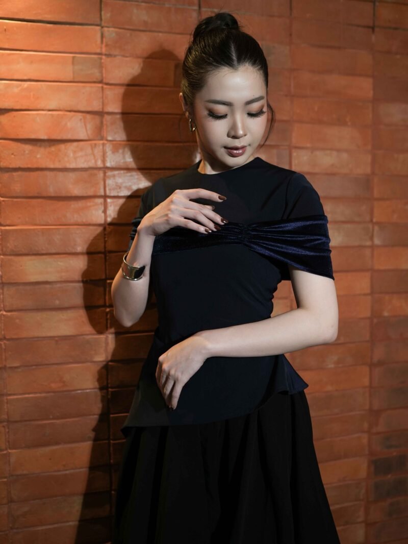 This top with a modern silhouette comes in two luxurious colors: Navy and Wine. Crafted from Rovalino fabric, renowned for its smooth texture, beautiful drape, and premium feel to every look.