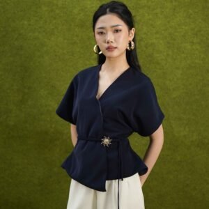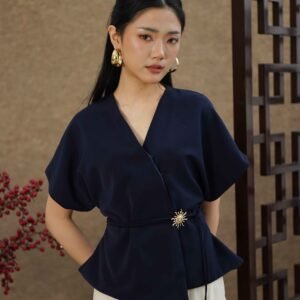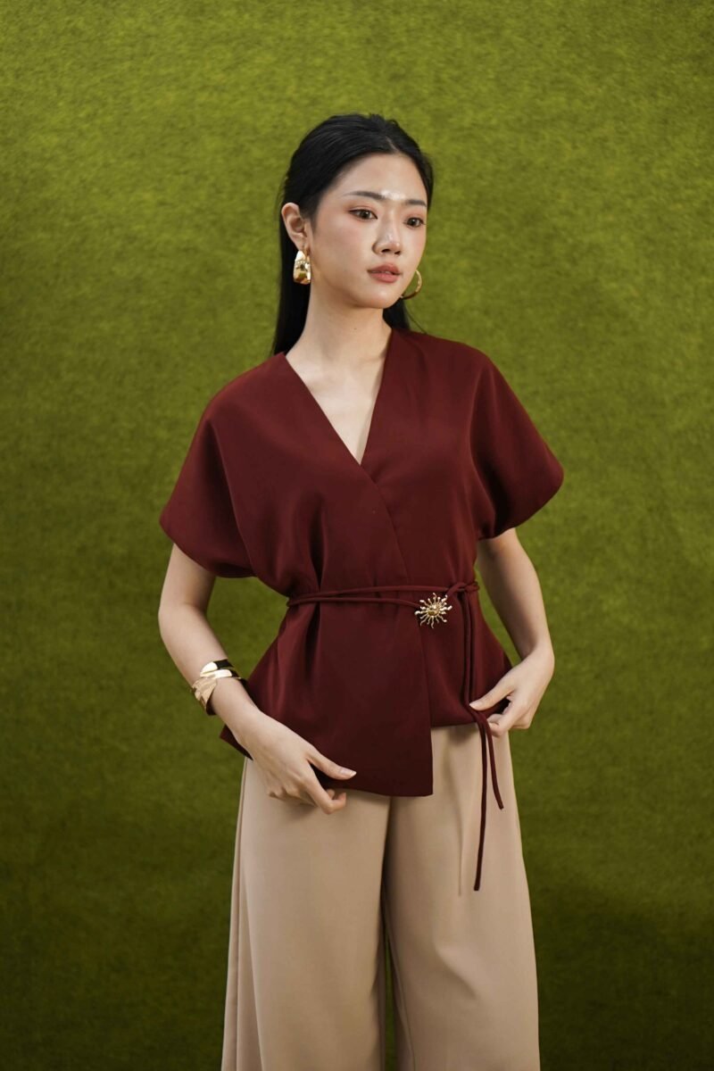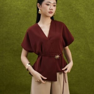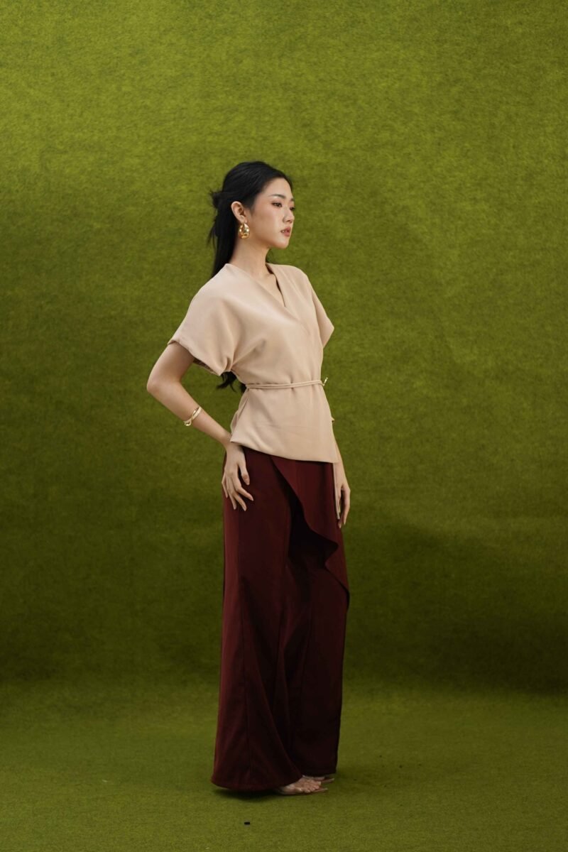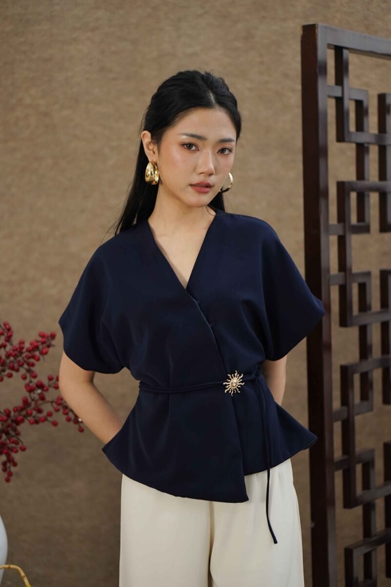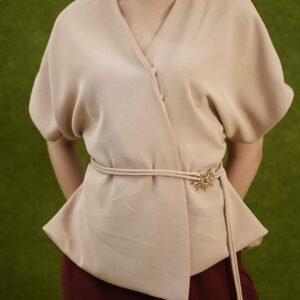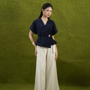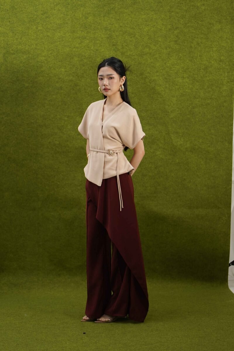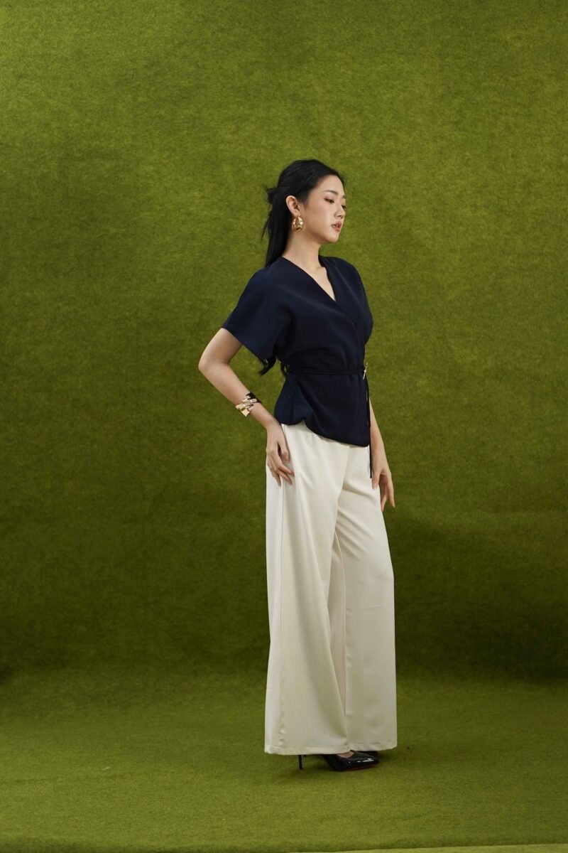 An elegant top with a modern design and clean silhouette, featuring a V-neck cut that gives an elegant yet professional impression. Made from a choice of materials according to color for comfort and the best look: semi-wool in a soft nude color that falls neatly and looks luxurious, and rovalino cotton in wine and jet blue in navy that is comfortable, breathable, and still looks structured.