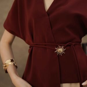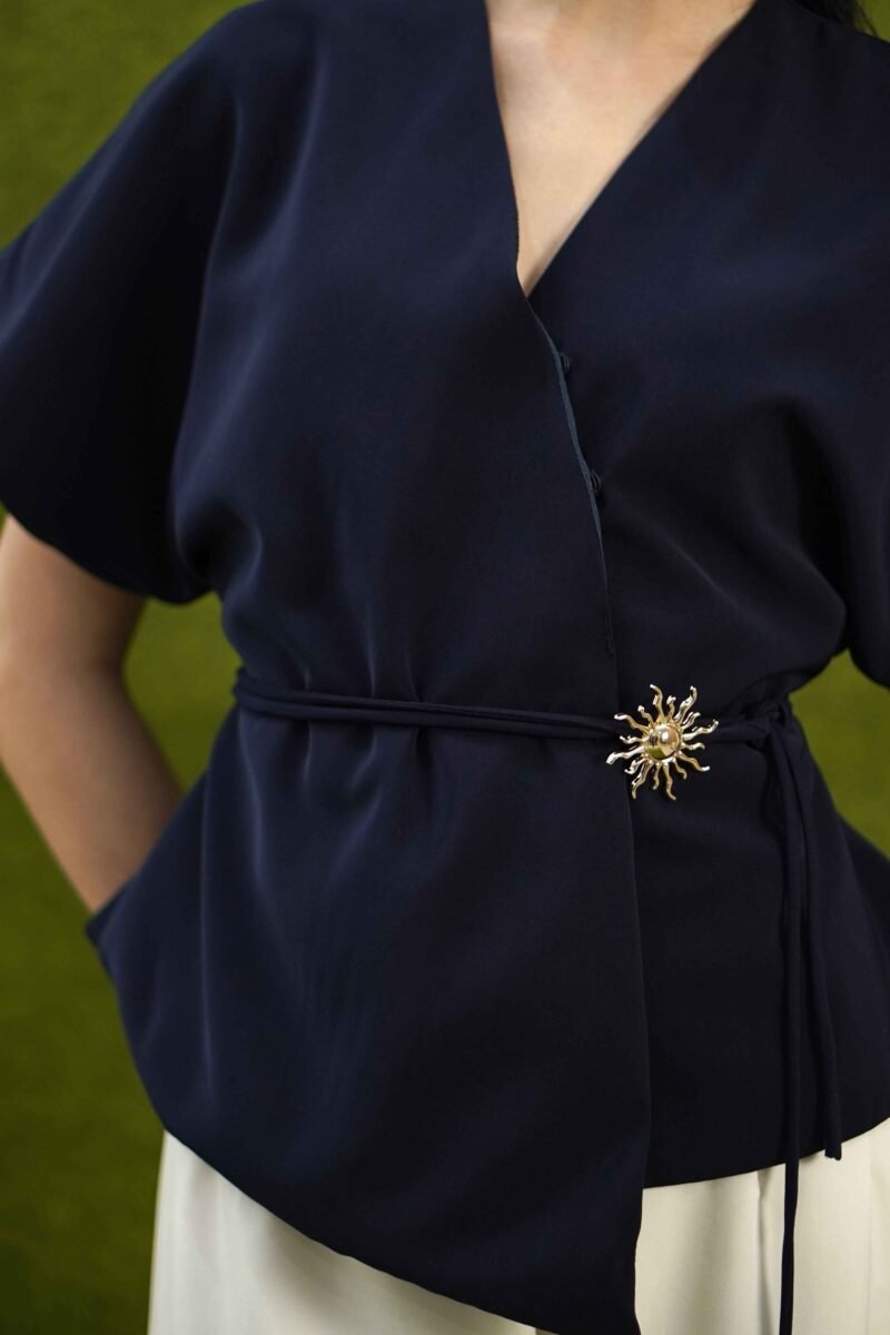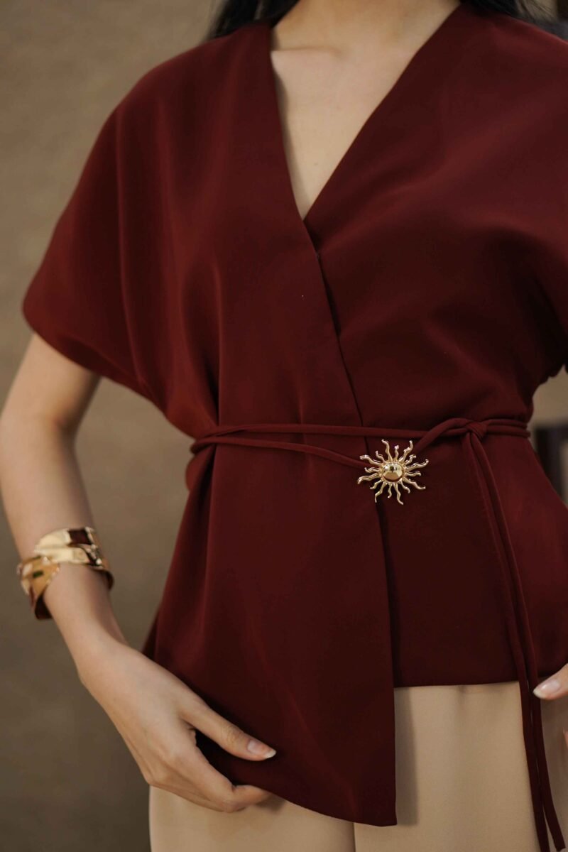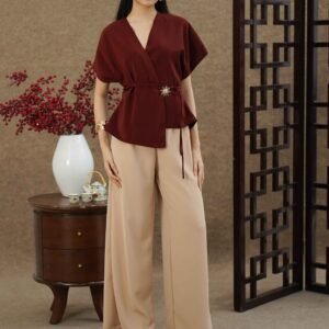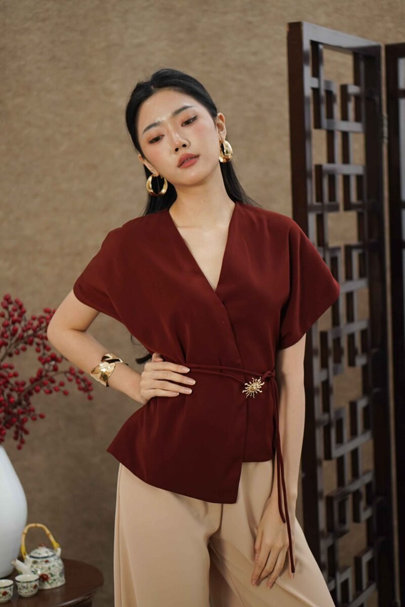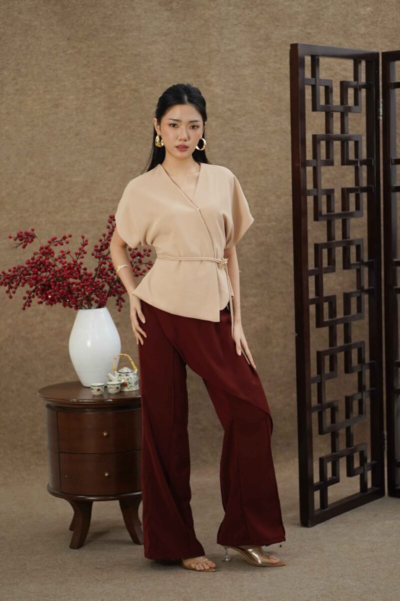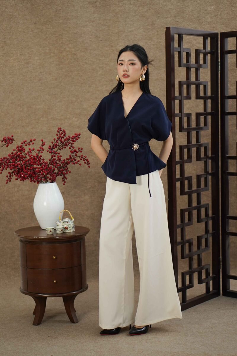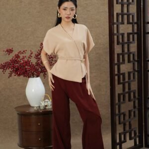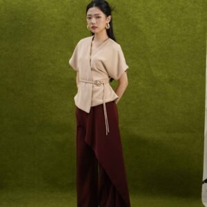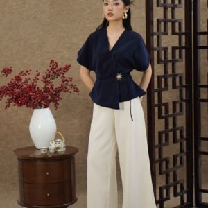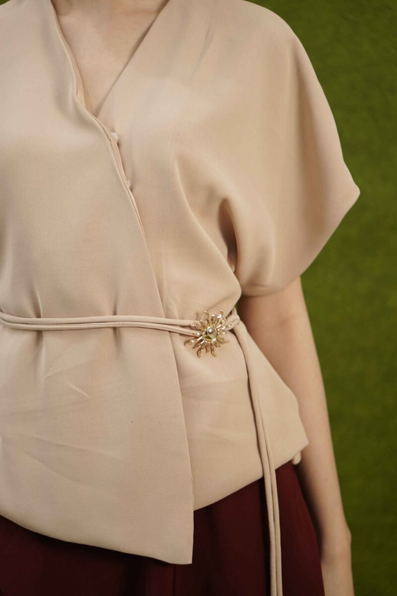 An elegant top with a modern design and clean silhouette, featuring a V-neck cut that gives an elegant yet professional impression. Made from a choice of materials according to color for comfort and the best look: semi-wool in a soft nude color that falls neatly and looks luxurious, and rovalino cotton in wine and jet blue in navy that is comfortable, breathable, and still looks structured.