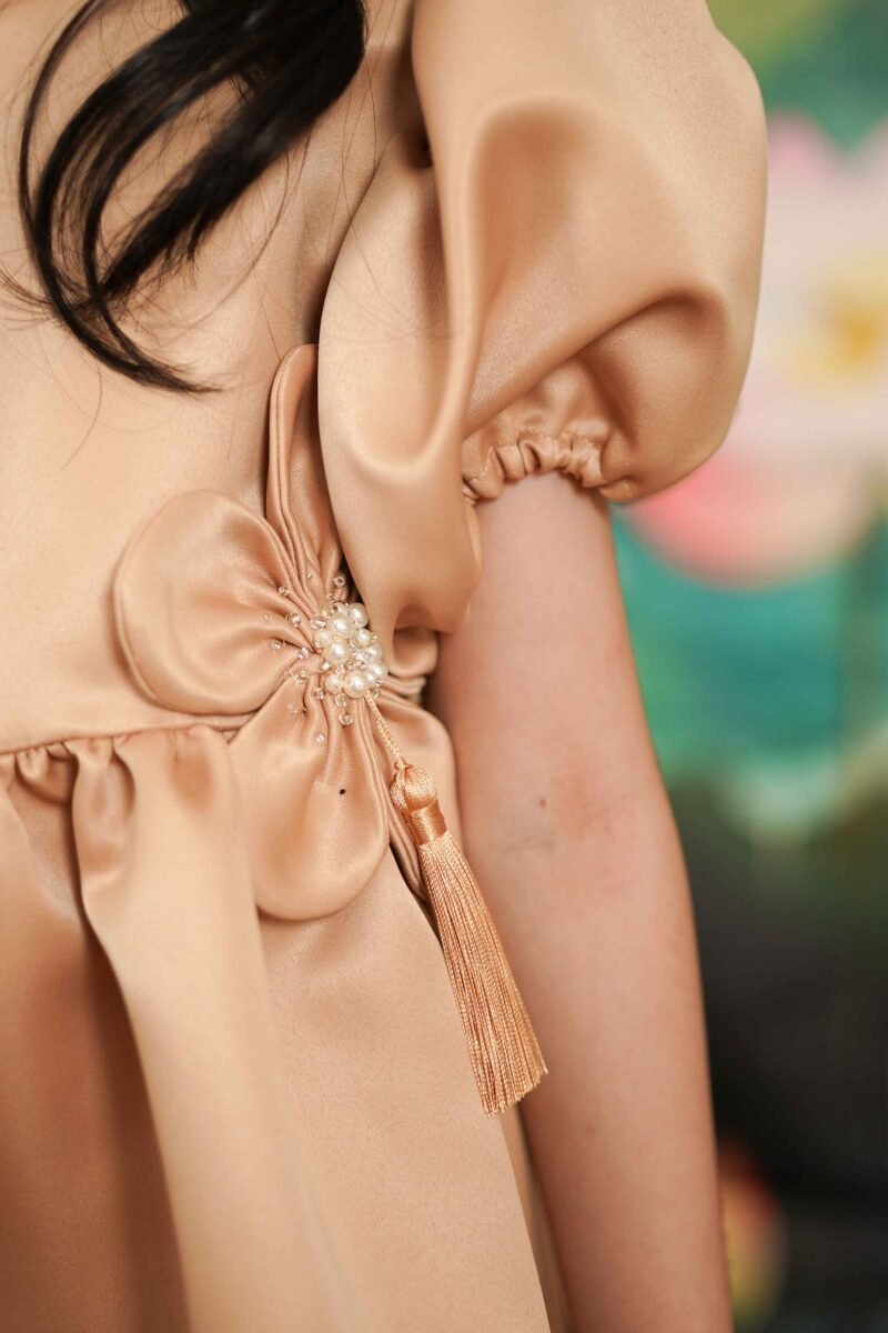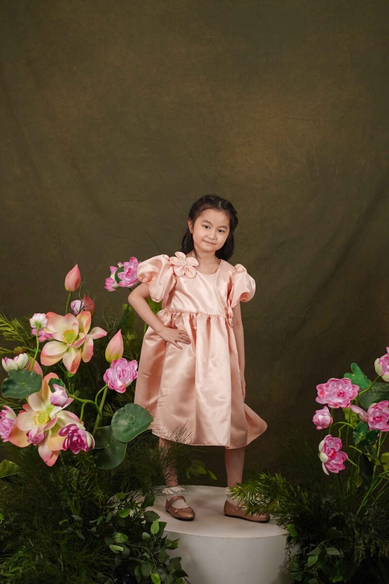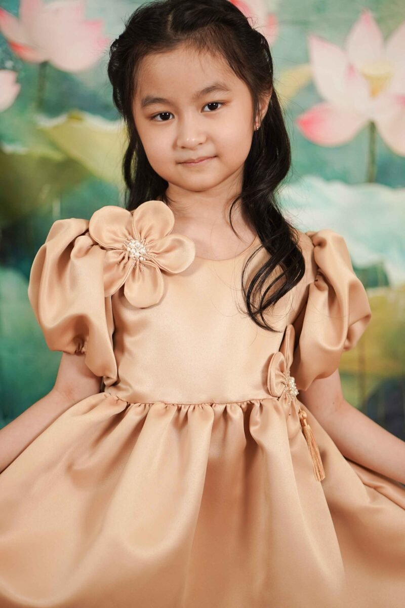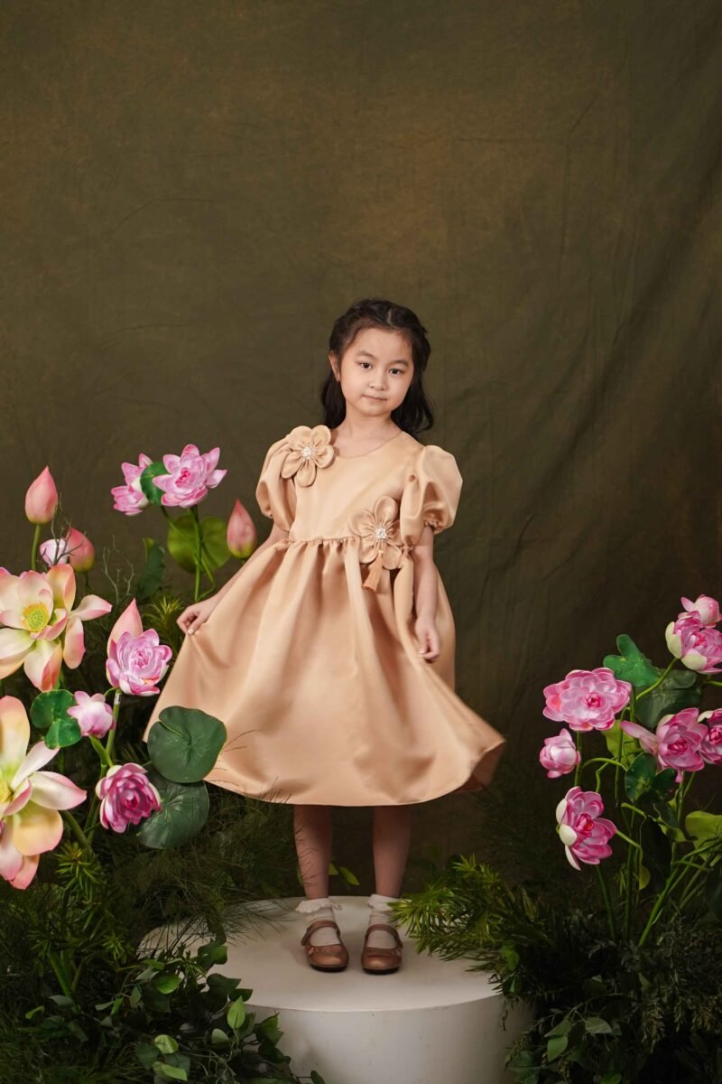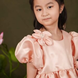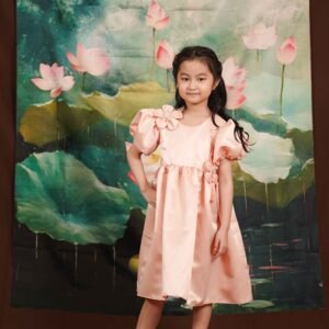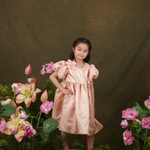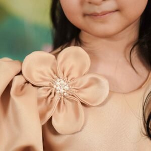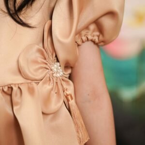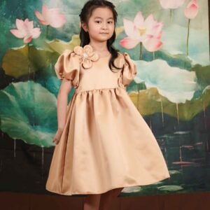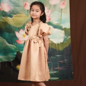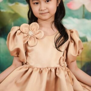 Children’s dress made from high-quality semi-wool fabric that is cool and soft, available in Gold, Pink, Navy, and Maroon. Features a balloon skirt detail at the waist, ribbons on the right and left sides, and floral embroidery on the front. Back zipper opening.