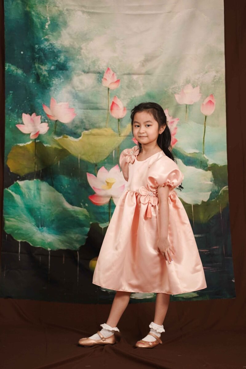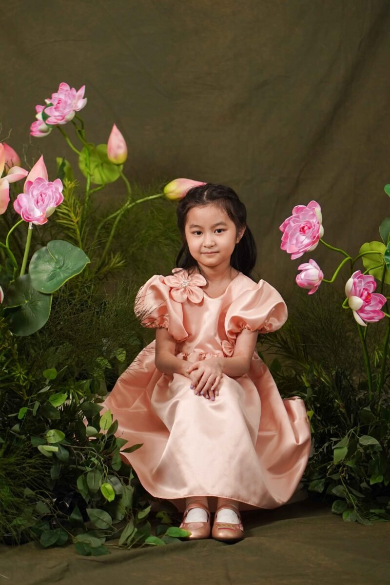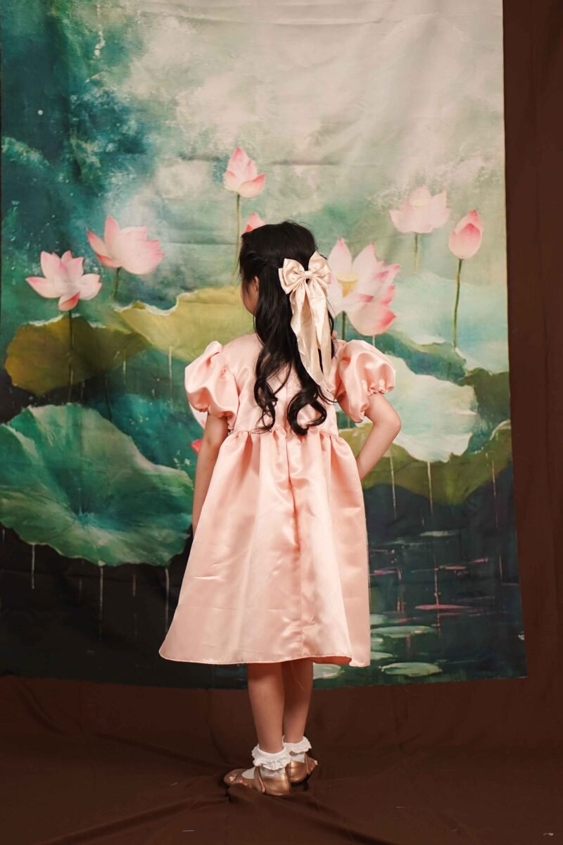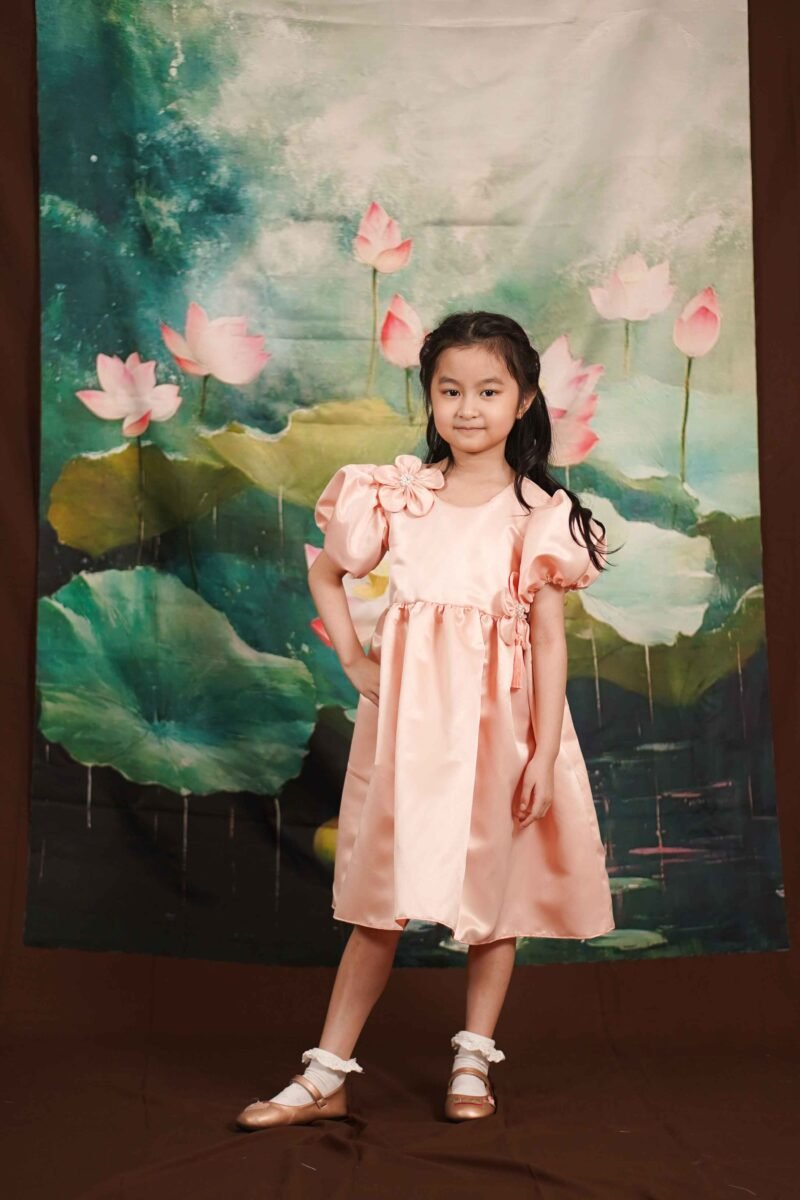 Children’s dress made from high-quality semi-wool fabric that is cool and soft, available in Gold, Pink, Navy, and Maroon. Features a balloon skirt detail at the waist, ribbons on the right and left sides, and floral embroidery on the front. Back zipper opening.