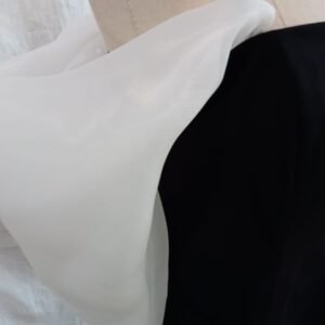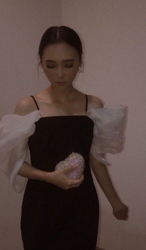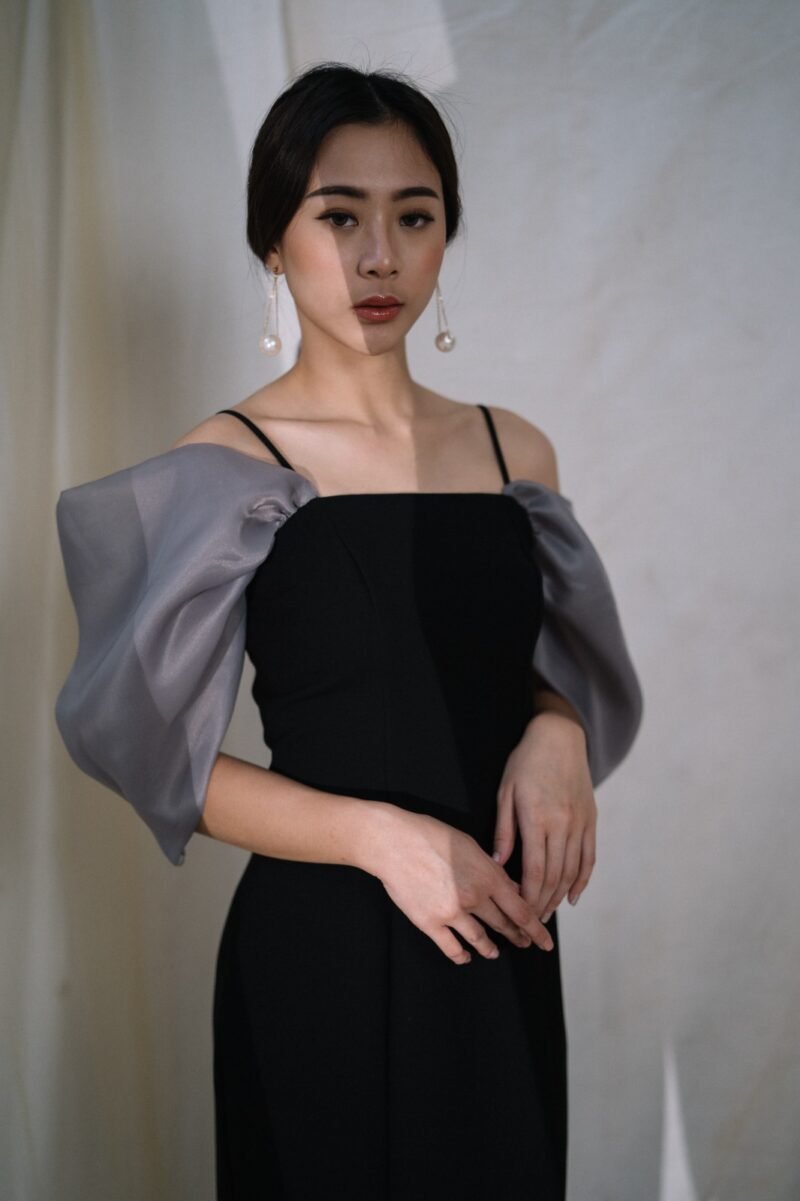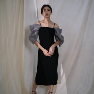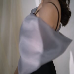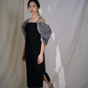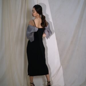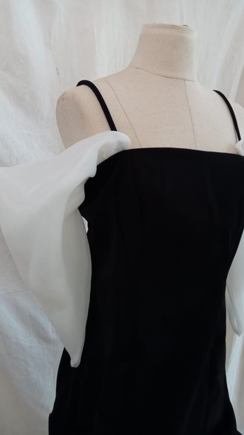 Dress with spagheti strap on the shoulder, sleeves made of organza material and slit details on the right and left side below.
