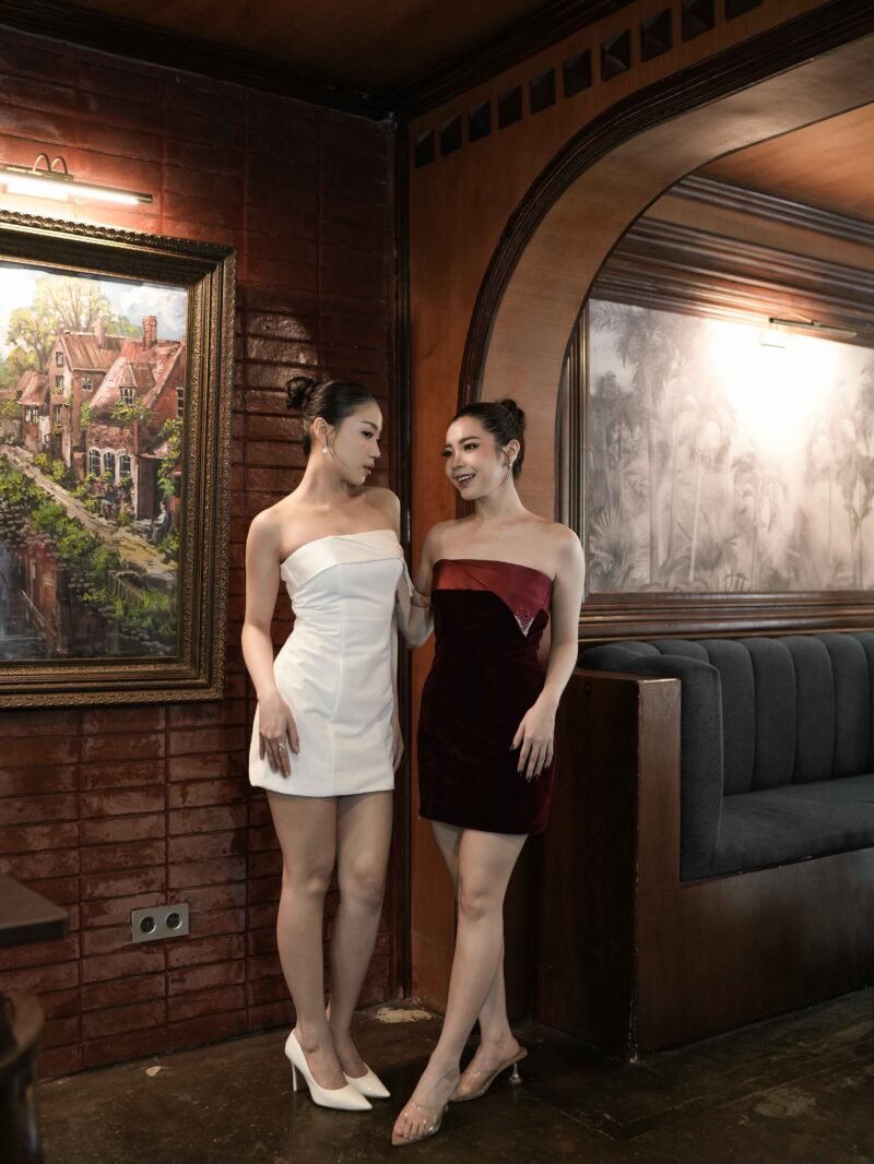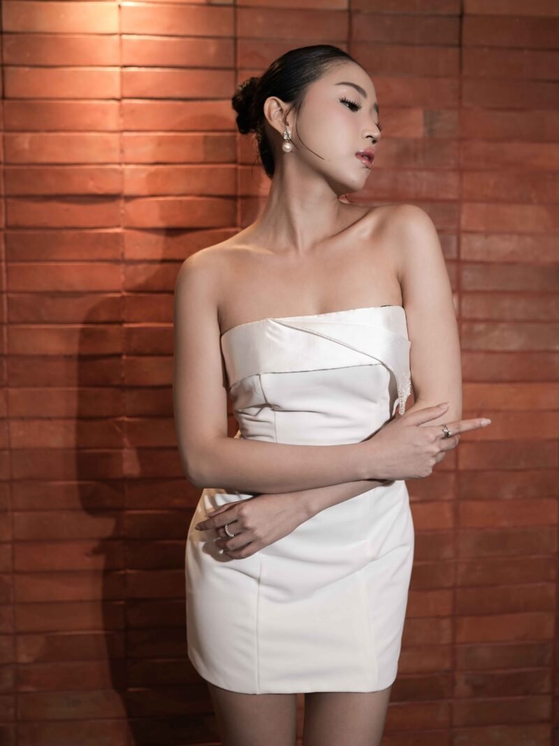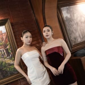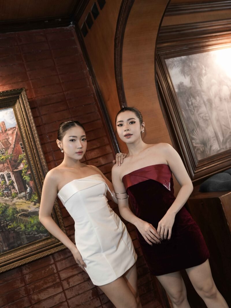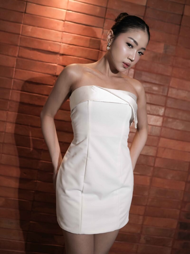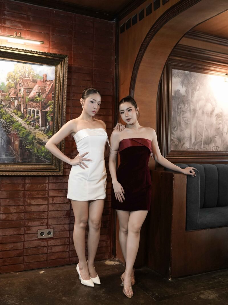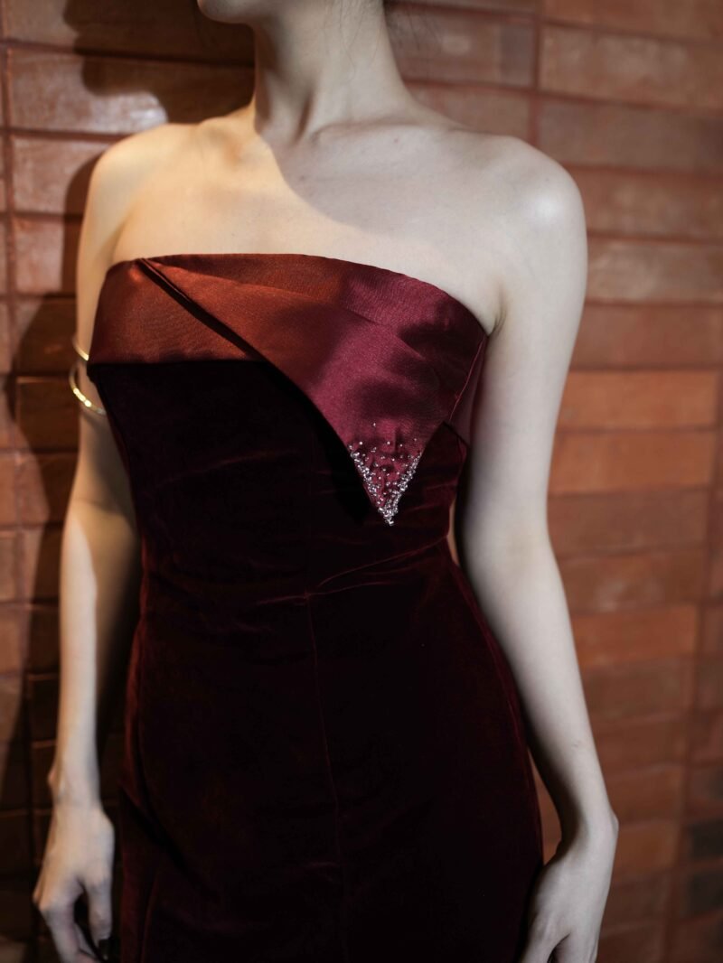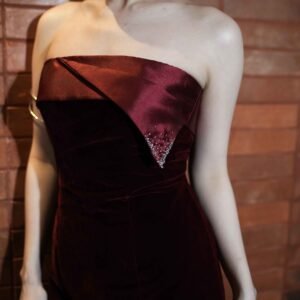 This dress features a modern and elegant strapless mini silhouette, made from a combination of sturdy Mikado fabric and velvet that gives a luxurious and soft impression. The combination of these two materials creates a structured yet glamorous look, perfect for special occasions.
