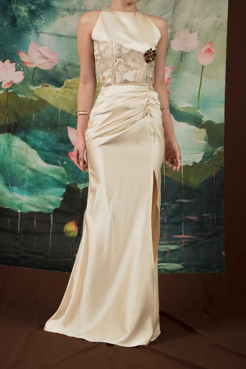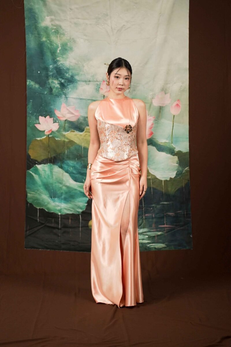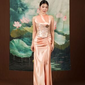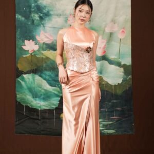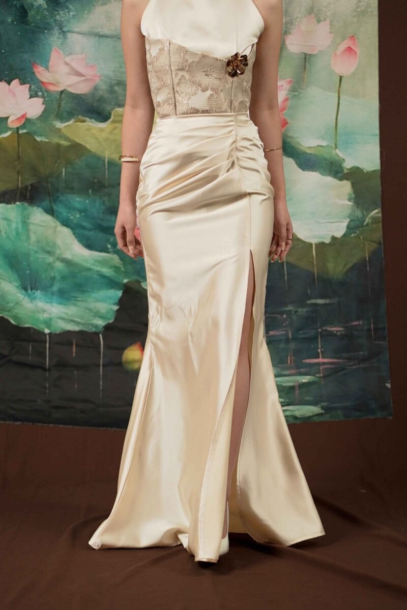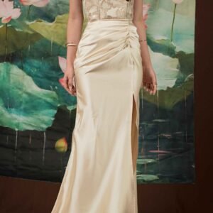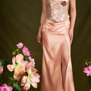 This skirt is designed with a long, elegant silhouette, showcasing a graceful, feminine look through a combination of two premium satin materials. Using Valentino satin for the ivory color and Kawasaki satin for the peach color, this skirt presents a luxurious look with a soft, sophisticated sheen. Satin has a smooth, flowing character, and creates a flowy effect when moving. This material emphasizes the slim and elongated impression of the body silhouette, so it looks elegant and classy.