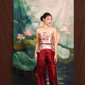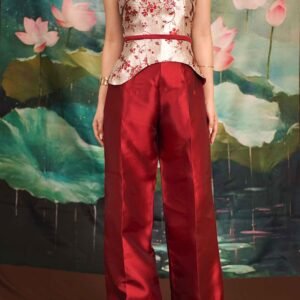 High-waisted long pants made from semi-wool material, available in Maroon, Silver, and Navy. Features an elastic waistband at the back and a side zipper opening. Very comfortable, cool, and lightweight.